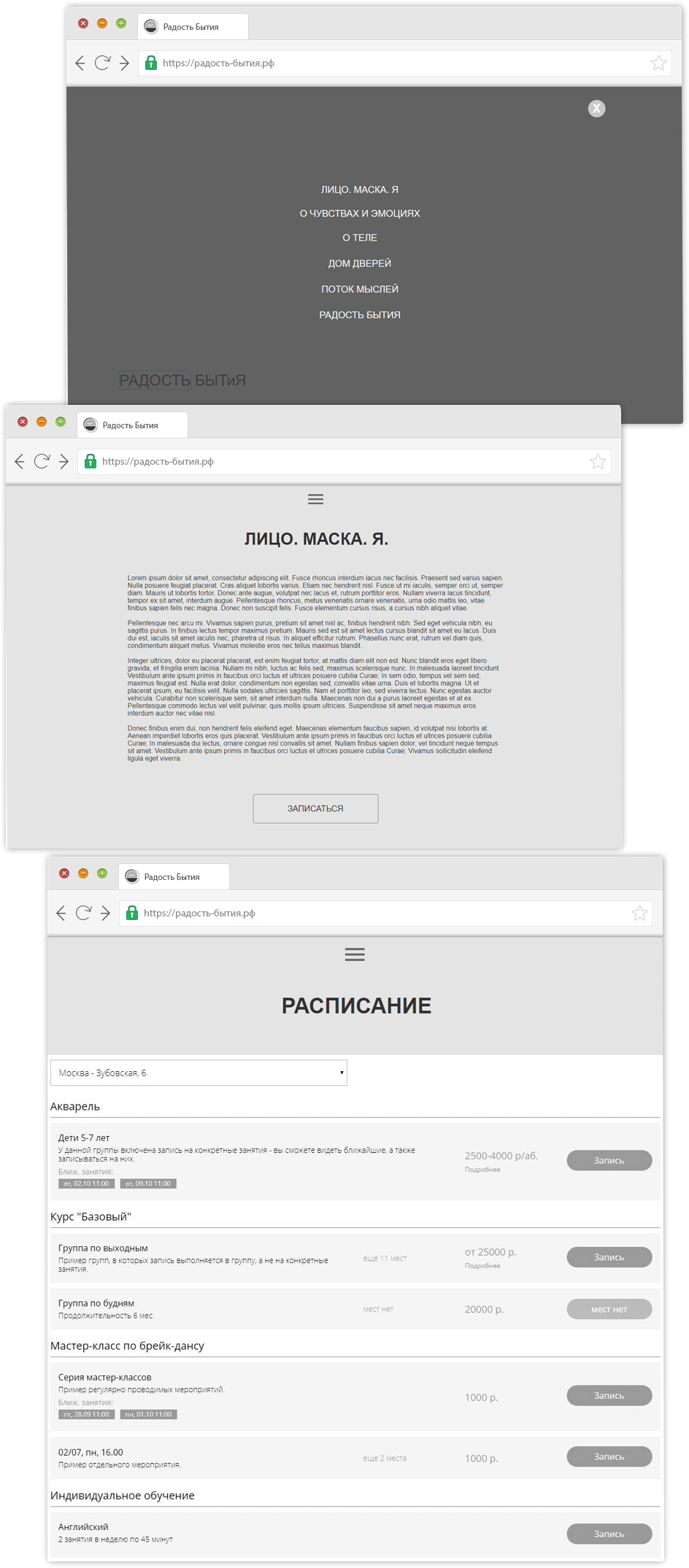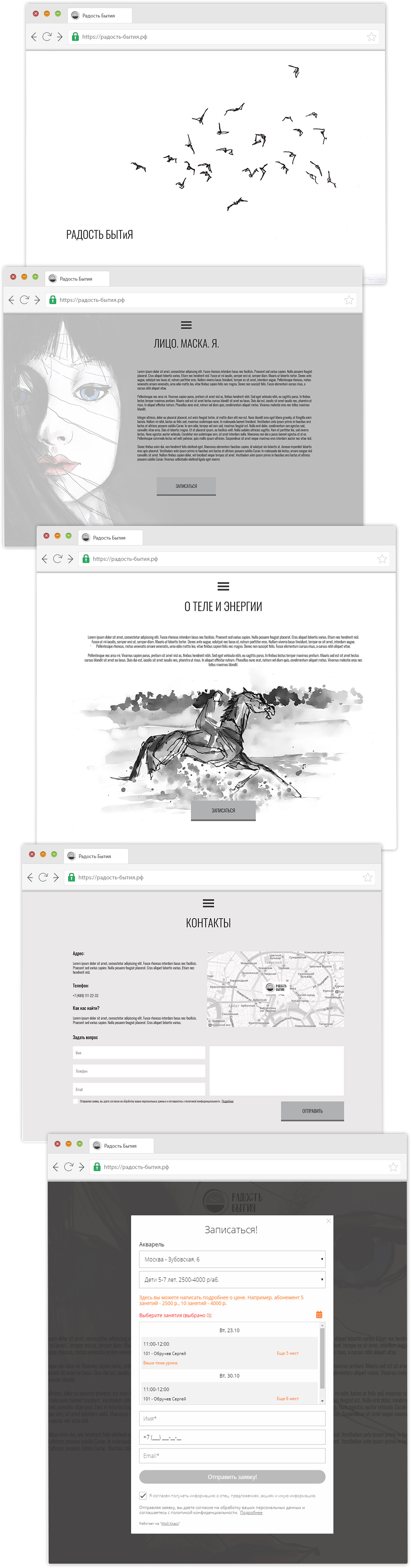 Каждая страница сайта представляет из себя мини-раздел, со своим дизайном и индивидуальной атмосферой. Каждый мини-раздел описывает отдельную услугу психолога и имеет функционал моментальной онлайн записи на курс.
