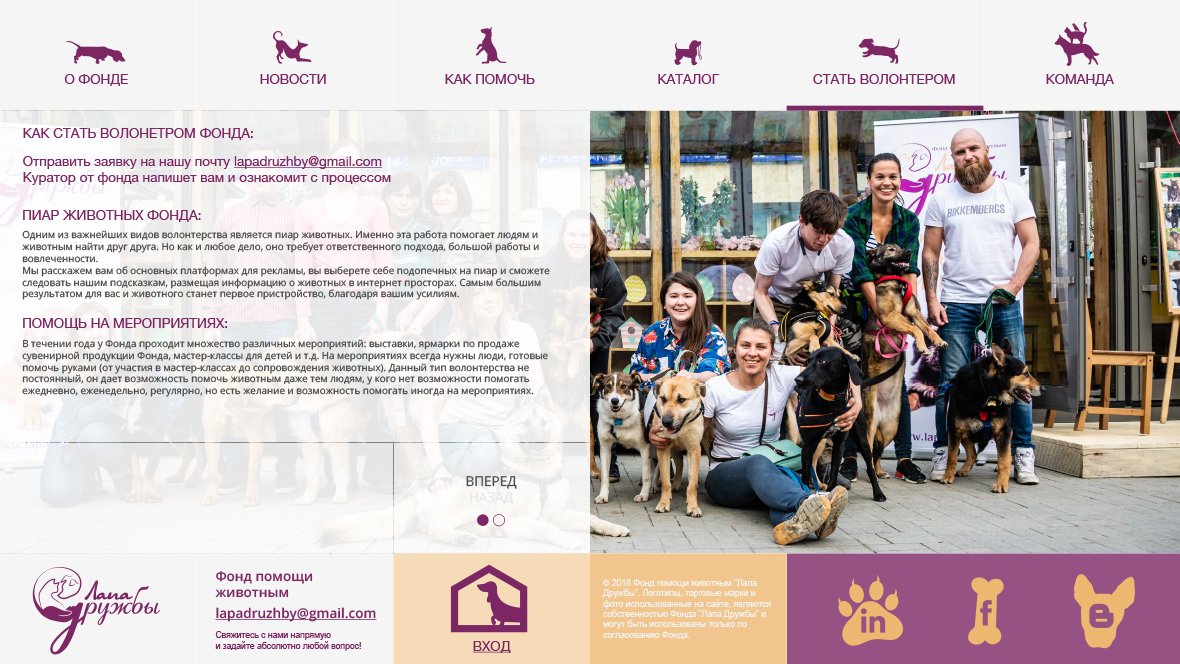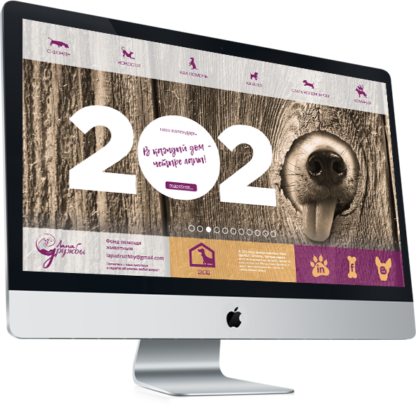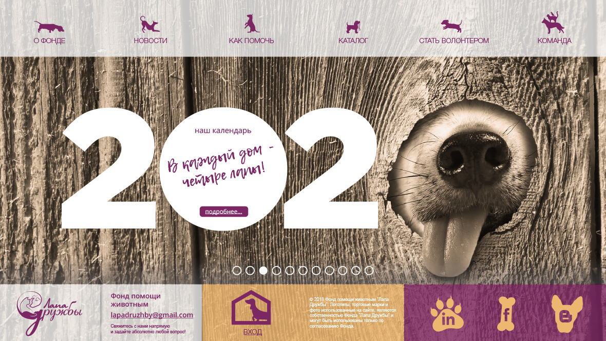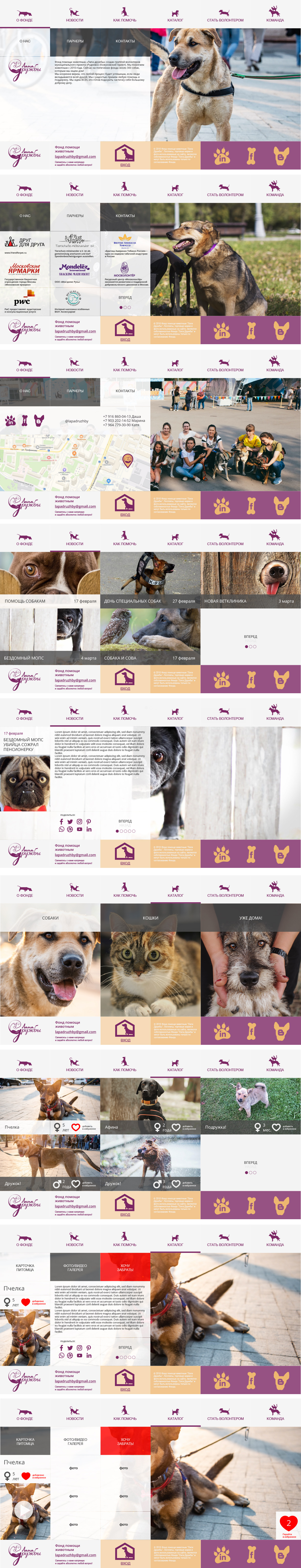 По задумке дизайнера, макет сайта создавался таким образом, что вся информация на любой странице помещалась "в один экран". Чтобы достичь такого эффекта мы использовали технологию слайдера и всплывающих окон. Каталог содержит всех всех животных фонда, по категориям. Карточка питомца содержит исчерпывающую информацию о животном, включая фото и видео. Все сделано для максимально удобного подбора своего нового домашнего питомца.
