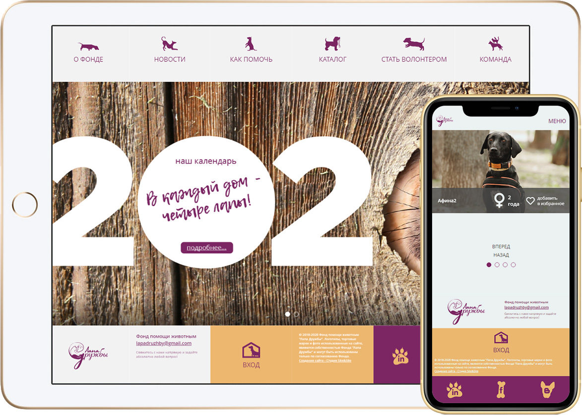Сайт фонда помощи животным полностью адаптирован под мобильные устройства. Посетитель сайта имеет доступ с телефона ко всей информации в удобном и понятном виде.