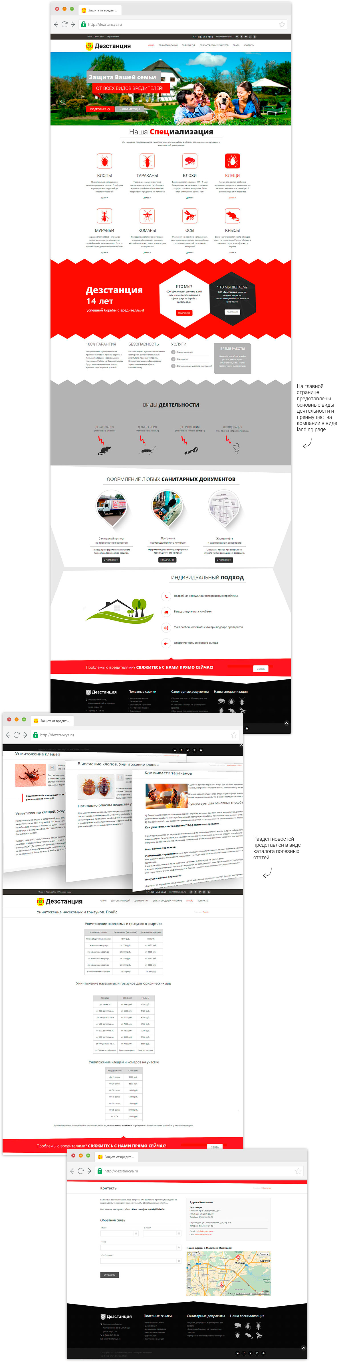 Информационный сайт компании оказывающей услуги по обработке помещений от насекомых. Сайт содержит всю необходимую информацию по всем направлениям услуг, которые оказывает компания. Так же сайт является информационным порталом, содержащим множество статей по данной тематике.