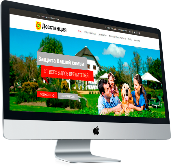 Индивидуальный дизайн сайта компании по защите от вредителей нарисован на основе цветовой гаммы и брендбука компании.