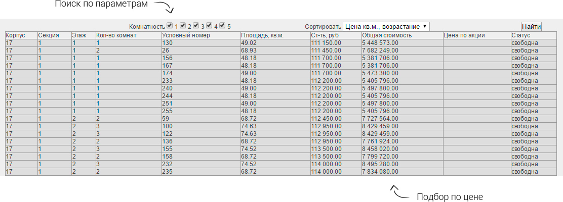 Список корпусов представлен отдельным меню, для удобства подбора.