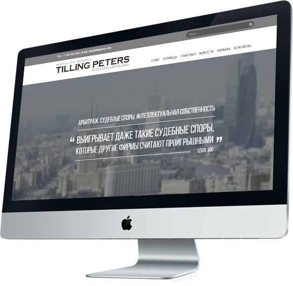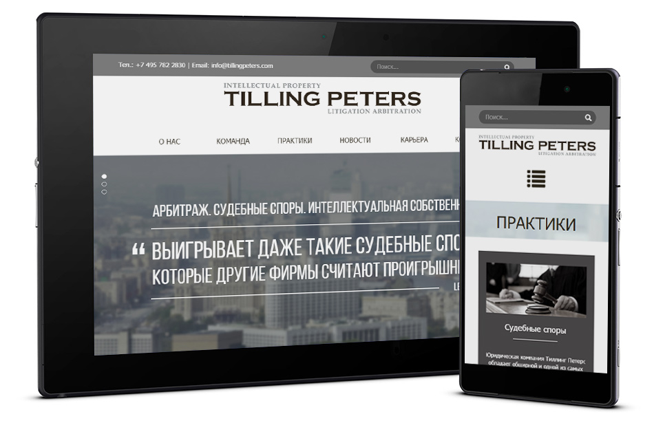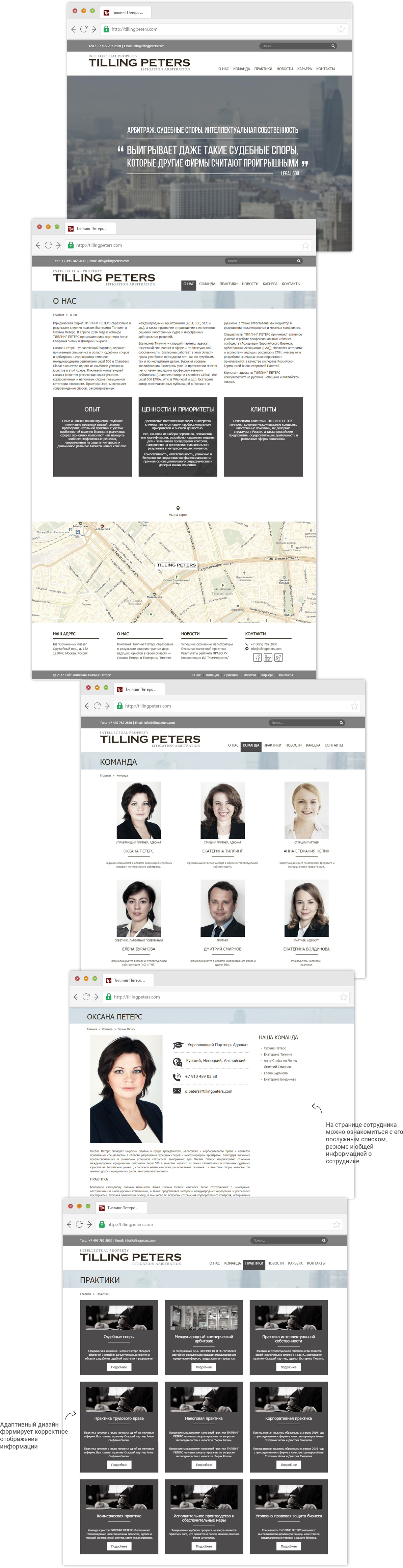 Дизайн сайта юридической компании разрабатывался на основе стилистической модели полиграфического дизайна компании.