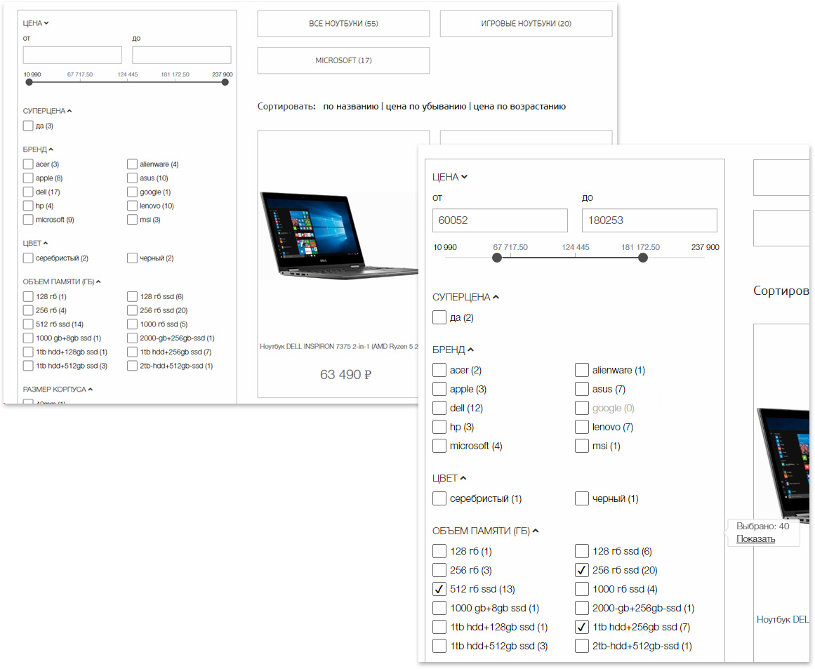 В каталоге интернет-магазина реализован функционал удобной фильтрации. Товары можно отбирать по диапазону цен, наличию или отсутствию выбранных характеристик, скидкам, спецпредложением и так далее.