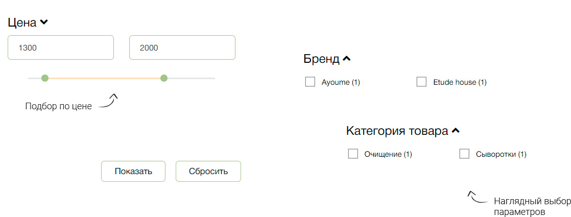 Фильтрация косметики в каталоге товаров позволяет гибко настраивать необходимые параметры для подбора нужных товаров. При этом, все параметры, которые отсутствуют по совокупности выбранных условий, будут отмечены фильтром, как не активные.