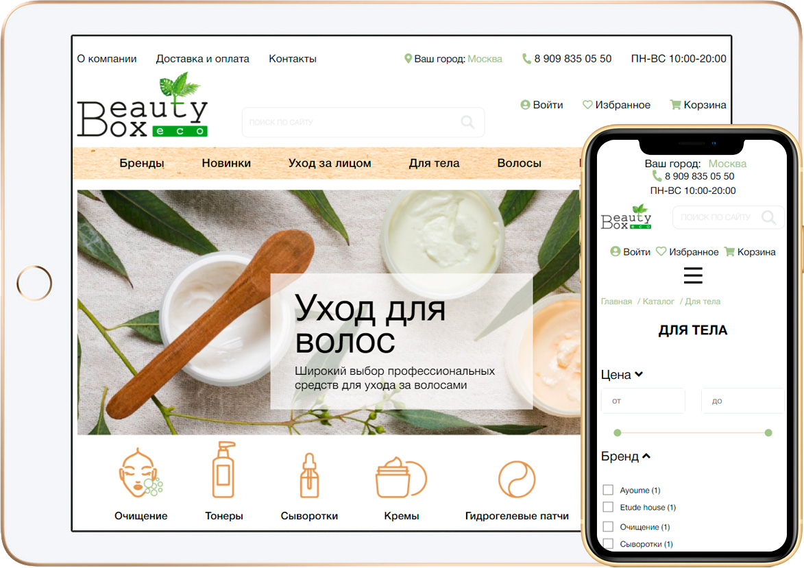 Интернет-магазин корейской косметики адаптирован под мобильные устройства.