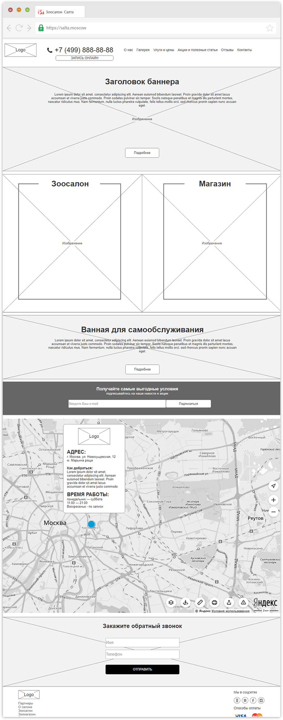 И, разумеется, контакты, с интерактивной картой и подробным описанием расположения зоосалона.