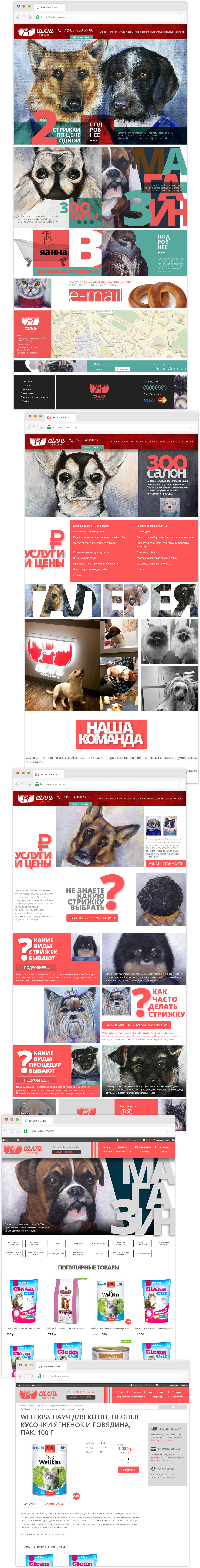 Во первых, это именно презентационный сайт салона для животных. Он содержит все необходимое, чтобы клиент, не блуждал в поисках нужной информации, а мог максимально быстро разобраться с услугами и ценами салона, связаться с менеджером в один клик или записаться на нужное время в режиме онлайн.