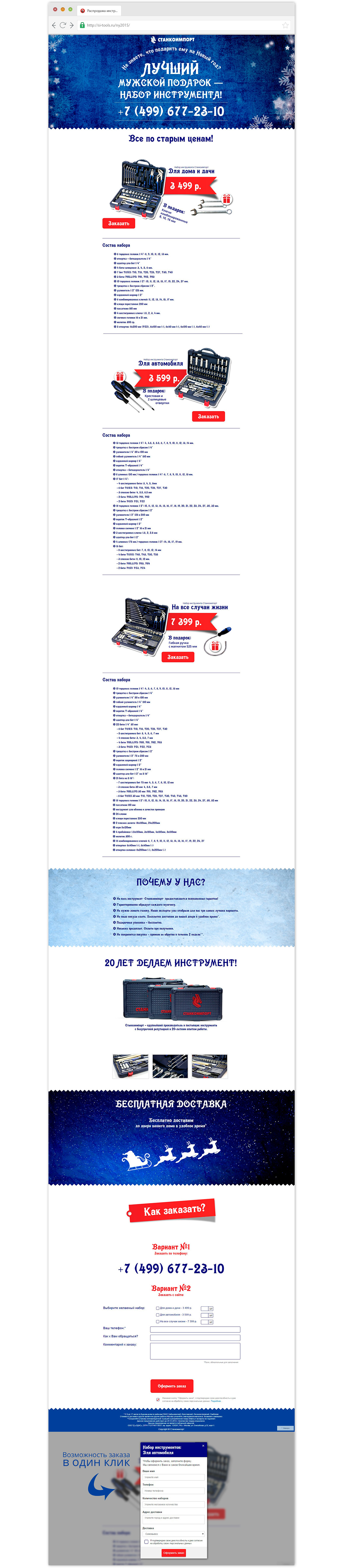 Лэндинг содержит подробное описание товаров, форму обратной связи, а так же функцию заказа товара в один клик.