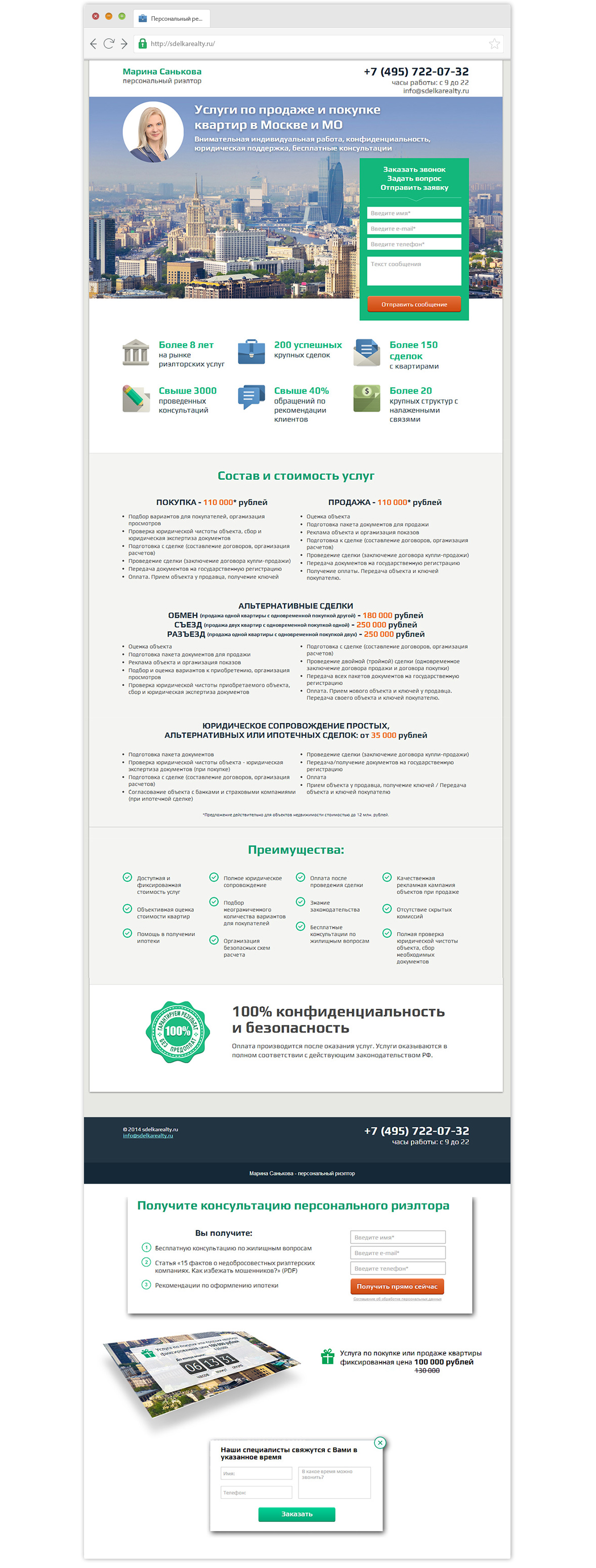 Промо-страница (Landing page) персонального риэлтора. Создана с целью быстрого привлечения целевых клиентов через сервисы контекстной рекламы.
